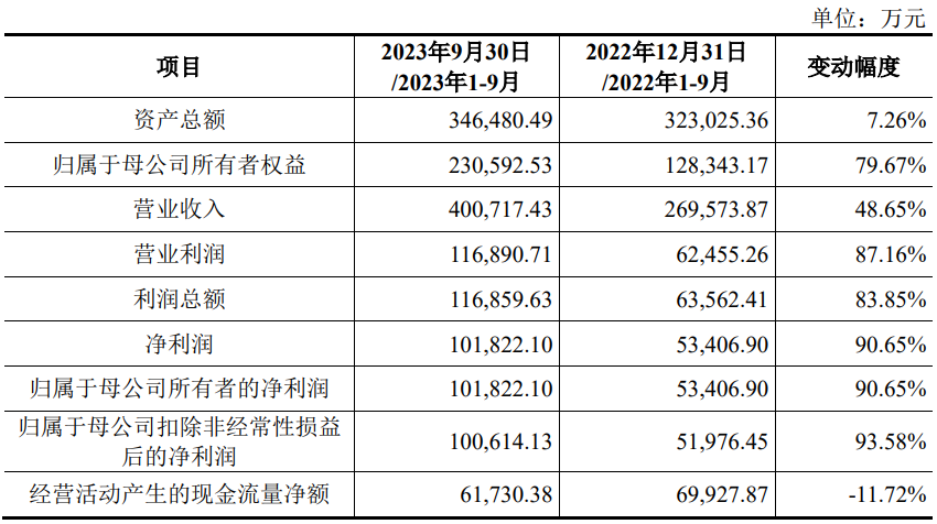 2023年1-9月,艾罗能源营业收入为400,717.43万元,较上年同期增长48.65%;净利润/归属于母公司股东的净利润为101,822.10万元,较上年同期增长90.65%;归属于母公司扣除非经常性损益后的净利润为100,614.13万元,较上年同期增长93.58%;经营活动产生的现金流量净额为61,730.38万元,较上年同期下降11.72%。