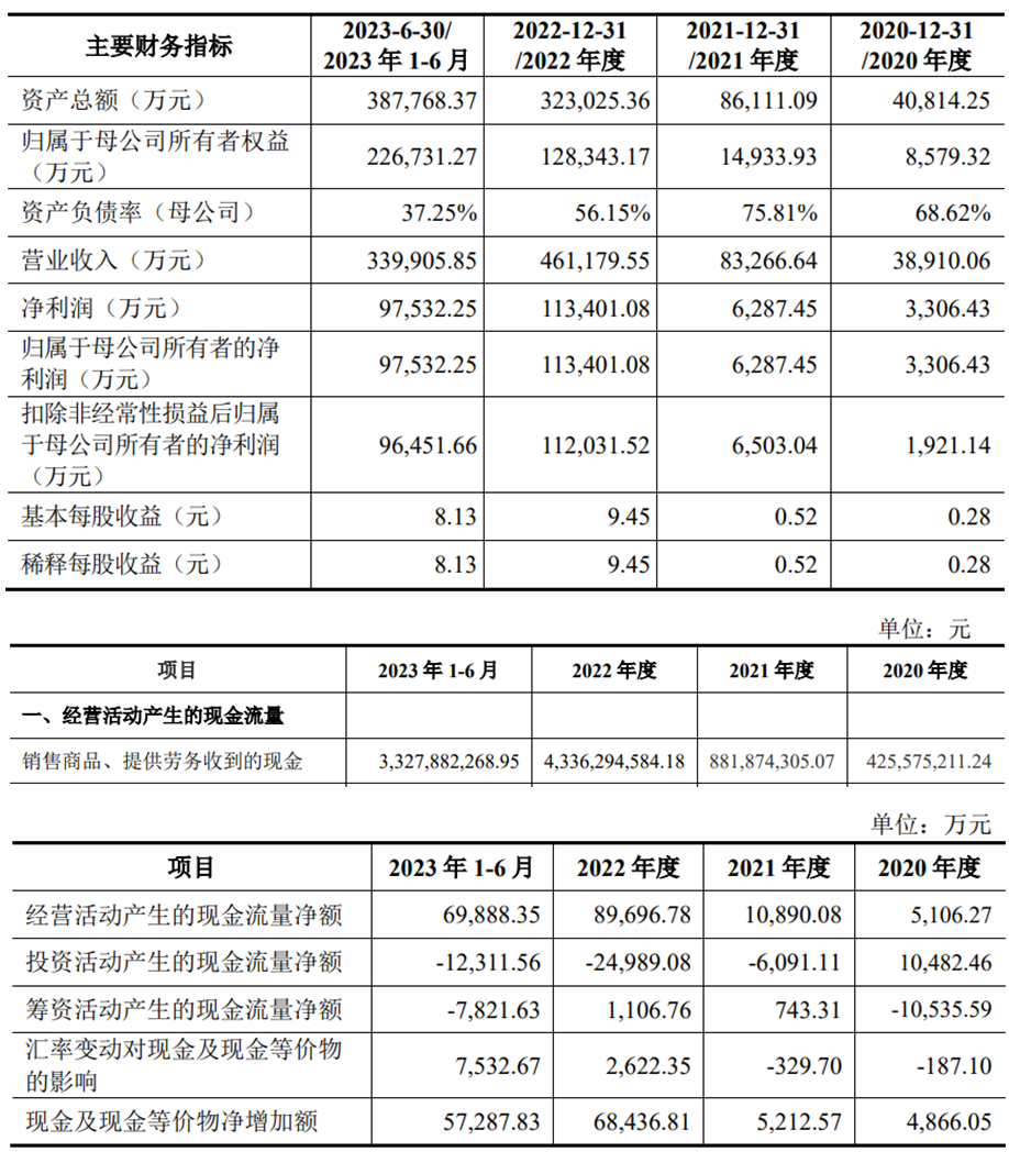 2020年至2023年1-6月,艾罗能源的营业收入分别为38,910.06万元、83,266.64万元、461,179.55万元和339,905.85万元;净利润/归属于母公司所有者的净利润分别为3,306.43万元、6,287.45万元、113,401.08万元和97,532.25万元;扣除非经常性损益后归属于母公司所有者的净利润分别为1,921.14万元、6,503.04万元、112,031.52万元和96,451.66万元。