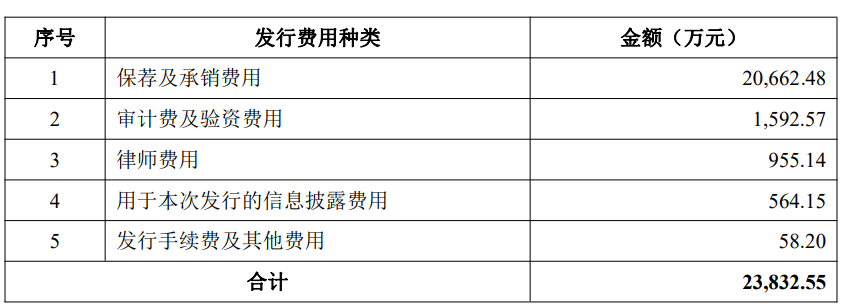 艾罗能源本次发行的发行费用总额为23,832.55万元(不含增值税),其中保荐及承销费用20,662.48万元。