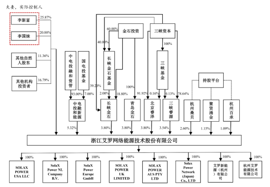 截至招股说明书签署日,据艾罗能源的股权结构图。可以看到,艾罗能源身后站着国家电投、金石投资、三峡资本、中科电投资、港银创投、浙创投等数十位资方。实际控制人李新富、李国妹夫妇合计持有46.75%的股份。在完成新股发行之后,李新富、李国妹夫妇仍然持有艾罗能源35.06%的股份。而此股份极有可能用于还债。
