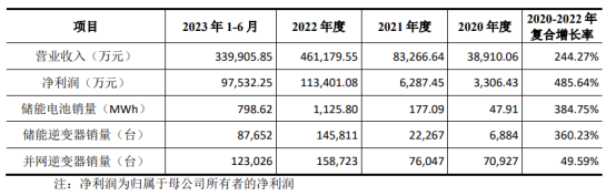 根据招股说明书显示,艾罗能源营业收入从2020年的3.89亿元,增长至2022年的46.17亿元,复合增长率为244.27%。增长了近12倍。净利润更是惊人,2020年到2022年仅仅三年的时间就翻了34倍。从0.33亿元增长11.34亿元,复合增长率为485.64%。这也正是艾罗能源冲击科创板的底气所在。