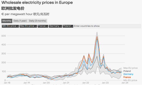 首先,就是欧洲批发电价的大幅下降。欧洲批发电价从2022年8月顶峰快速滑落,现如今与俄乌战争之前的电价持平。2022年八月欧洲最高批发电价为543.48欧元/兆瓦时,而现在欧洲最高批发电价只有138.19欧元/兆瓦时,下跌了74.57%。