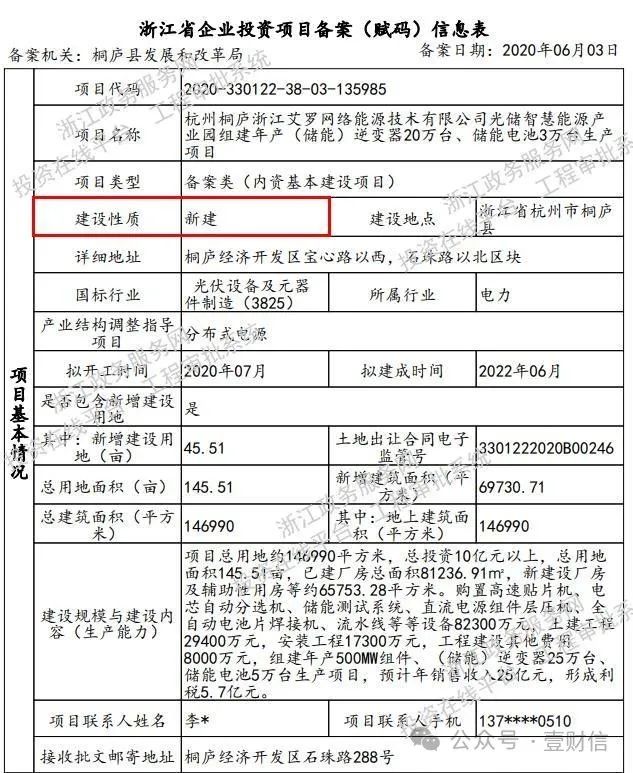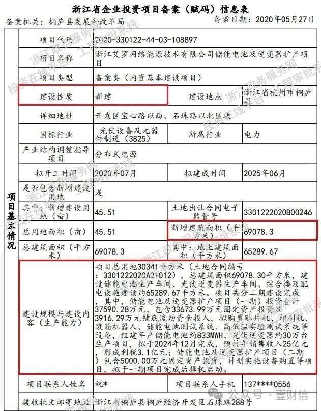 巧合的是,艾罗能源另一建设项目——杭州桐庐浙江艾罗网络能源技术有限公司光储智慧能源产业园组建年产(储能)逆变器20万台、储能电池3万台生产项目(下称“光储智慧能源系统产业园项目”)的新增建筑面积正好是69,730.71平方米。