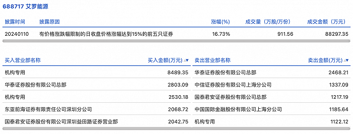 1月01日,艾罗能源今日涨16.73%,全天换手率达49.12%,振幅达23.33%。龙虎榜数据显示,营业部席位合计净买入1.06亿元。其中,机构买入1.1亿元,卖出1122.12万元,合计净买入9897.4万元。此外,华泰证券总部、东亚前海证券深圳分公司分别买入2803.09万元、2068.72万元;华泰证券总部、中信证券上海分公司分别卖出2468.21万元、1337.09万元。