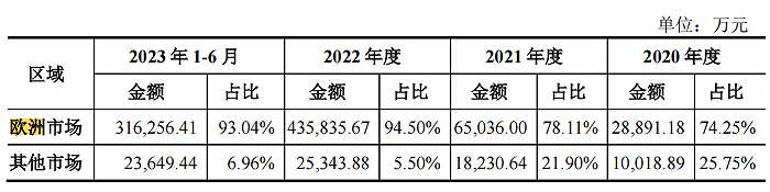 究其原因,2022年欧洲户储市场大爆发使得该公司业绩飙涨。海外市场一直是艾罗能源的营收来源,2019年以来,其海外营收占比均超过97.83%。其中欧洲市场占比逐年提高,欧洲市场占比从2020年的超74%提升至2022年的94.5%。