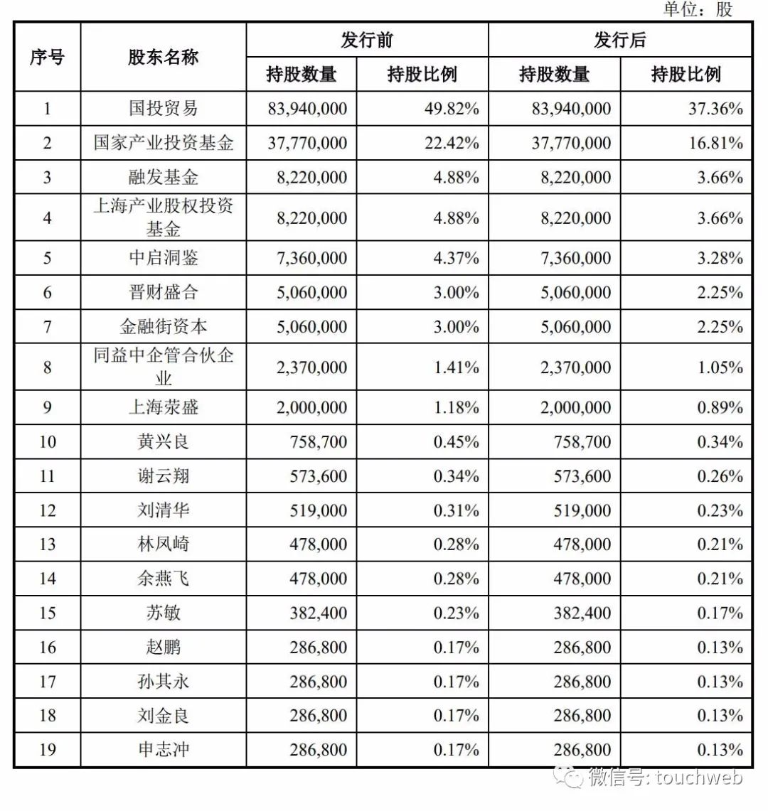 IPO后,国投贸易持股为37.36%,国家产业投资基金持股为16.81%,融发基金持股为3.66%,上海产业股权投资基金持股为3.66%,中启洞鉴持股为3.28%,晋财盛合、金融街资本分别持股为2.25%。