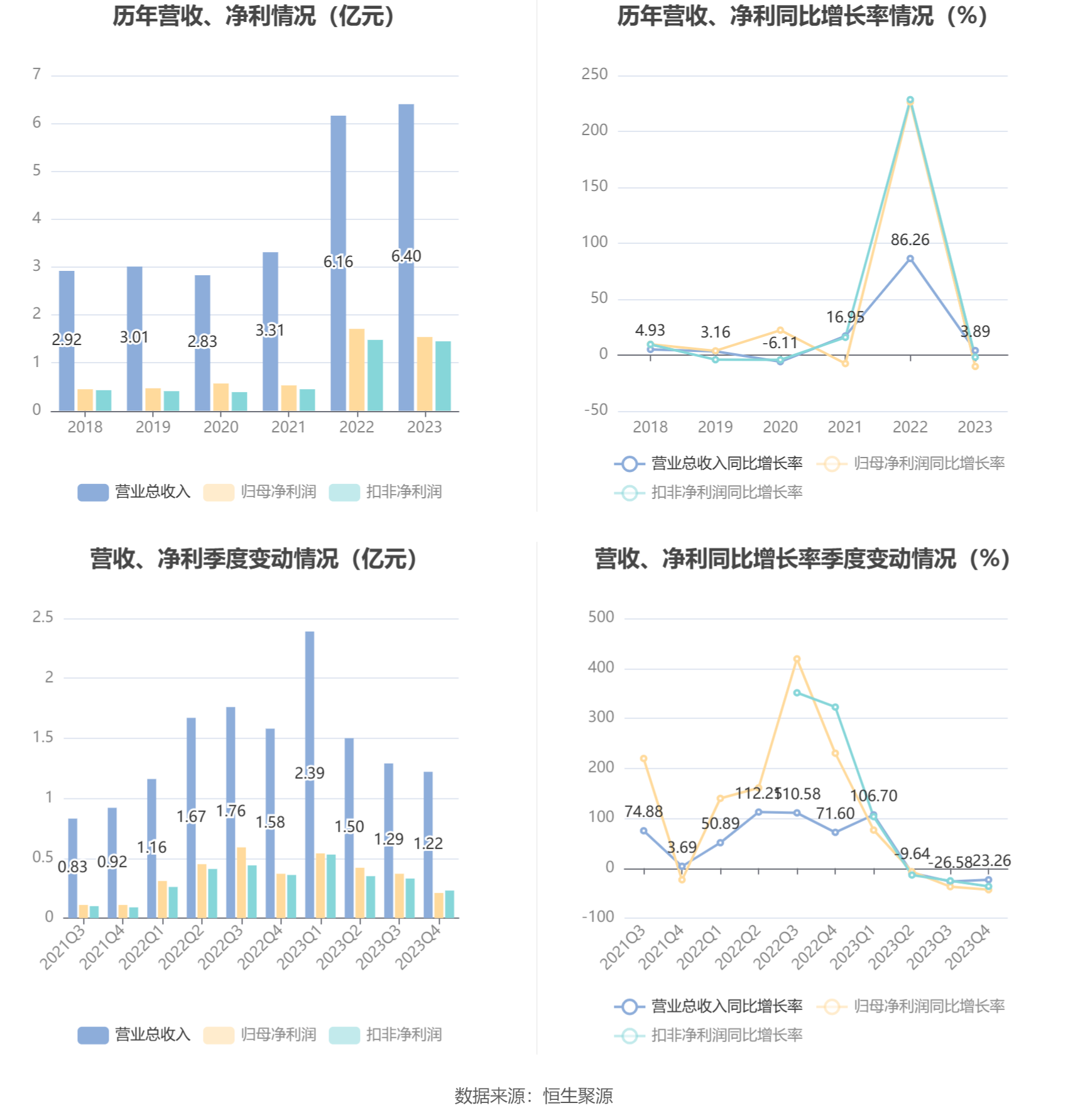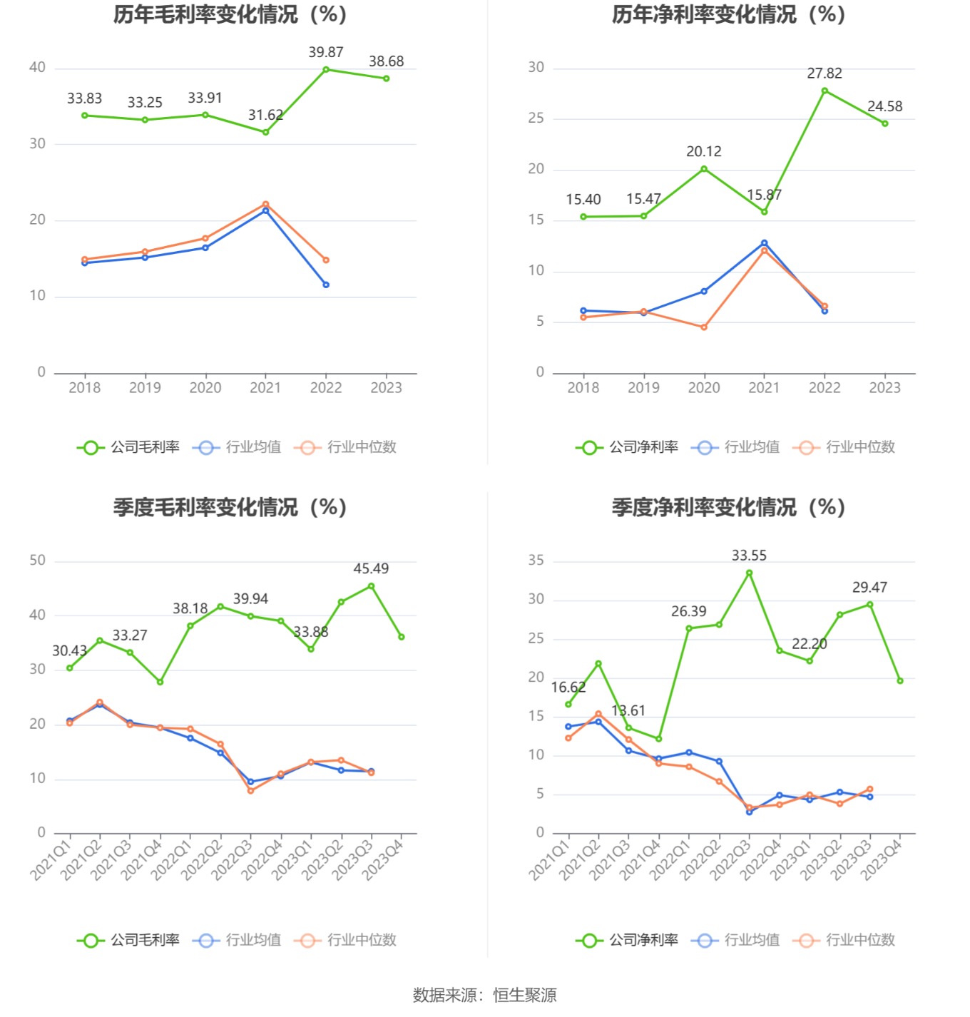 2023年,公司毛利率为38.68%,同比下降1.19个百分点;净利率为24.58%,较上年同期下降3.24个百分点。从单季度指标来看,2023年第四季度公司毛利率为36.13%,同比下降2.95个百分点,环比下降9.36个百分点;净利率为19.65%,较上年同期下降3.88个百分点,较上一季度下降9.82个百分点。