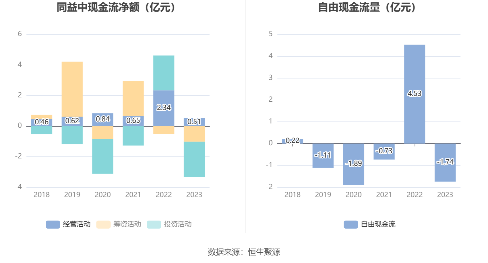 进一步统计发现,2023年公司自由现金流为-1.74亿元,上年同期为4.53亿元。
