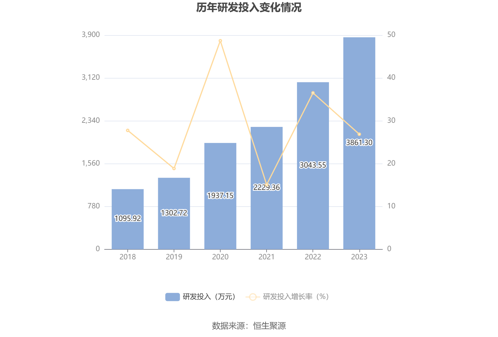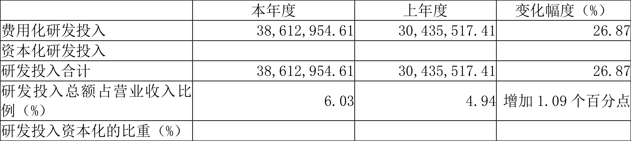 2023年全年,公司研发投入金额为3861.3万元,同比增长26.87%;研发投入占营业收入比例为6.03%,相比上年同期上升1.09个百分点。
