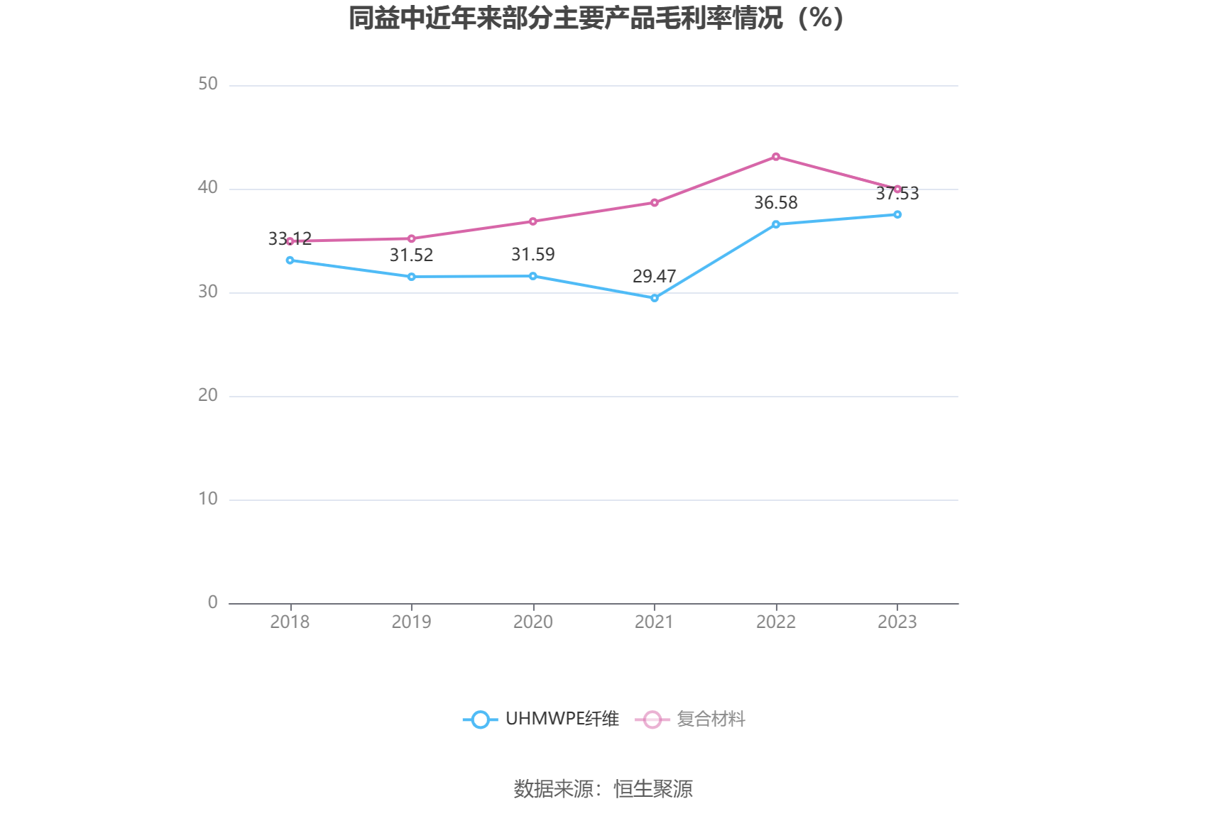 分产品看,UHMWPE纤维、复合材料2023年毛利率分别为37.53%、39.98%。