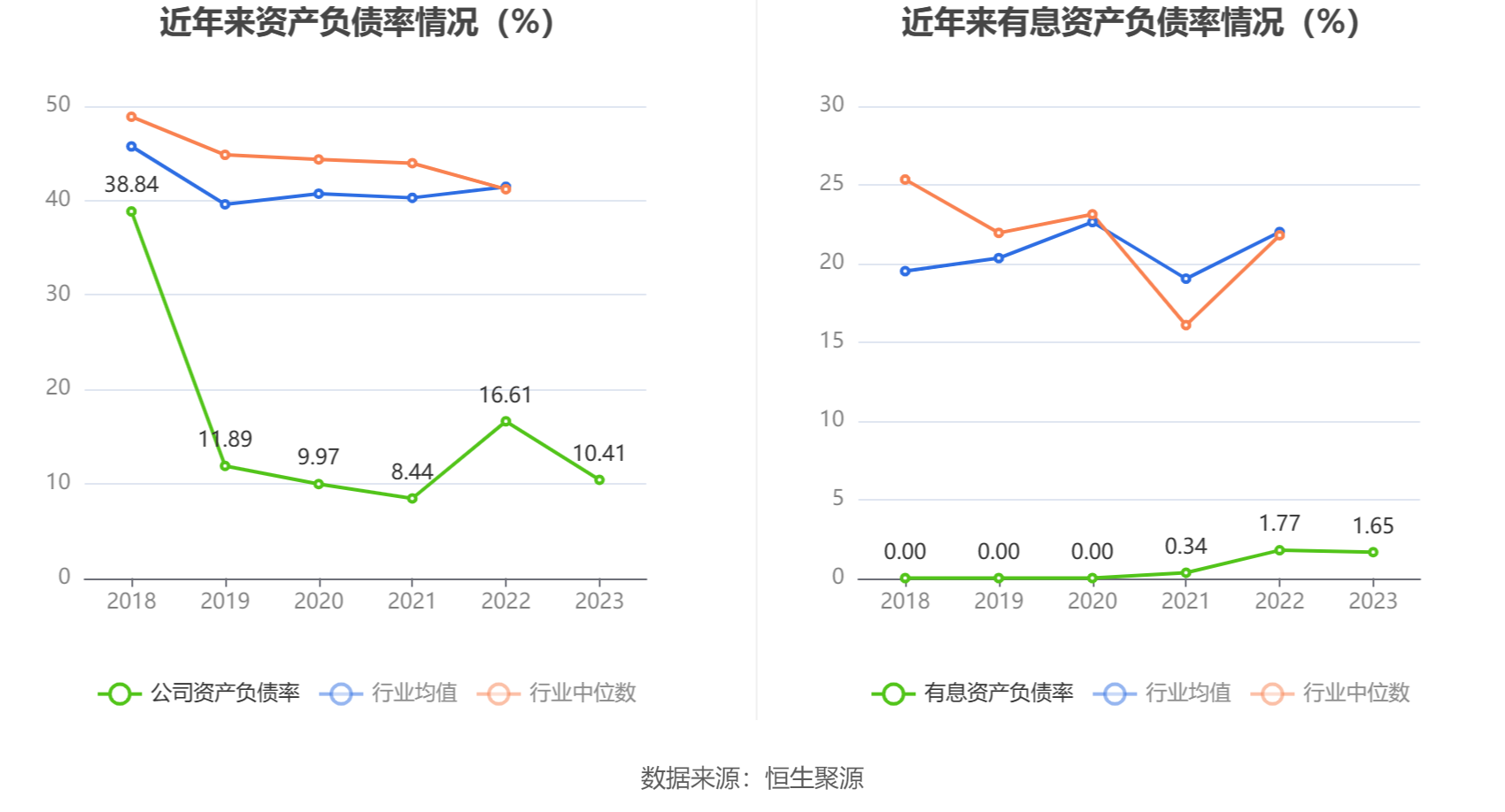 在偿债能力方面,公司2023年年末资产负债率为10.41%,相比上年末下降6.20个百分点;有息资产负债率为1.65%,相比上年末下降0.12个百分点。