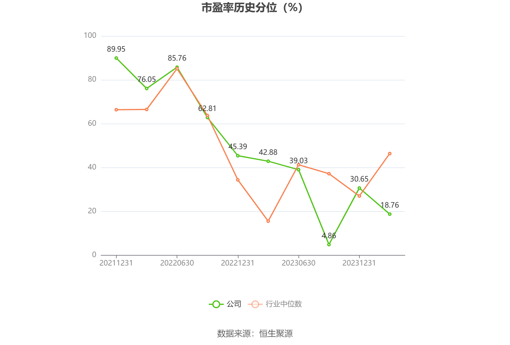 市盈率为负时,不显示当期分位数,会导致折线图中断。