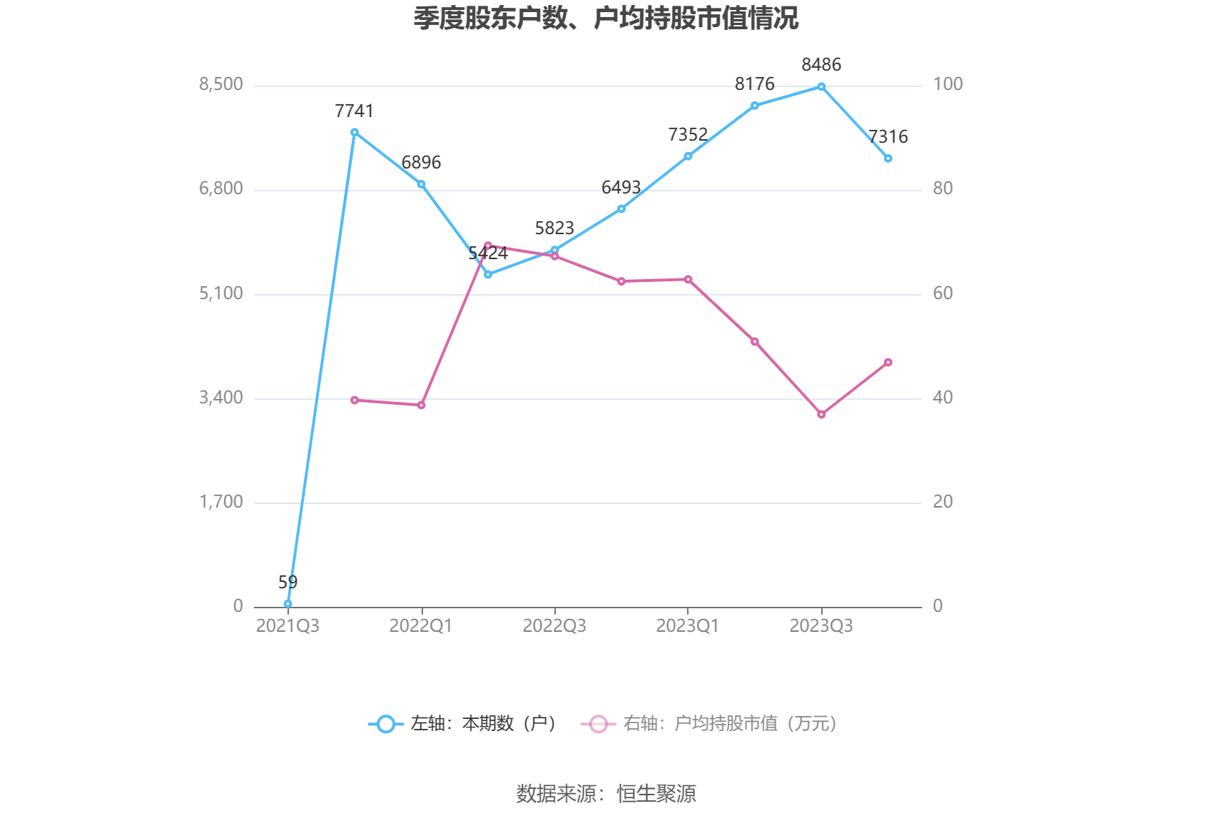 筹码集中度方面,截至2023年年末,公司股东总户数为7316户,较三季度末下降了1170户,降幅13.79%;户均持股市值由三季度末的36.99万元上升至46.98万元,增幅为27.01%。