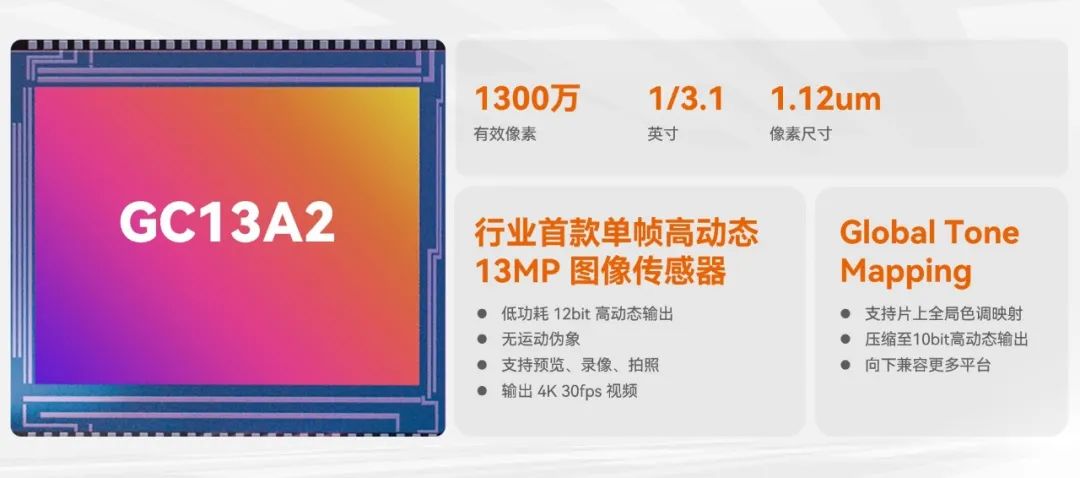 GC13A2还支持片上全局色调映射(Global Tone Mapping),将12bit数据实时压缩到10bit输出,保留高动态效果的同时可兼容更多智能手机平台。