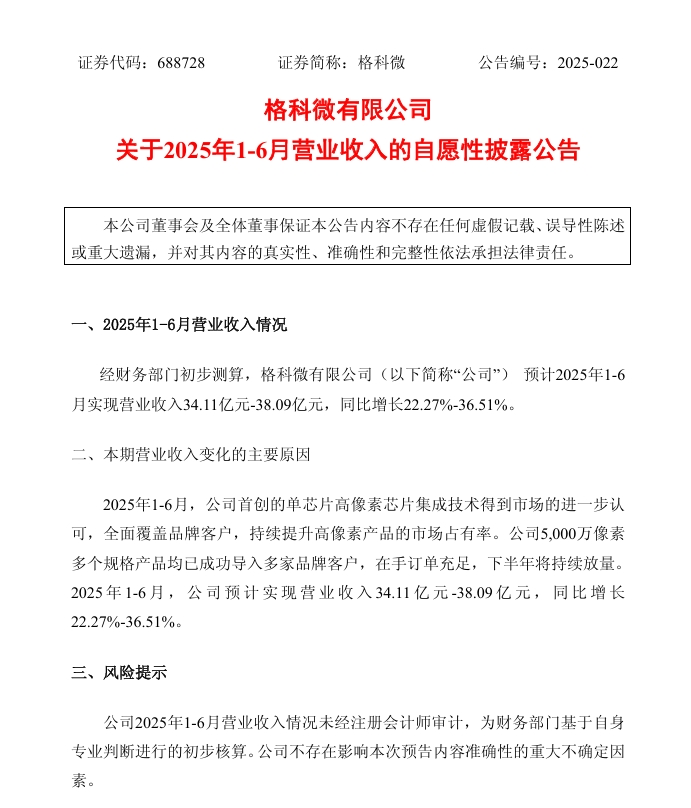 近日,格科微发布的业绩预告显示,2025年上半年,预计实现营收同比增长22.27%-36.51%,达到34.11亿-38.09亿元。