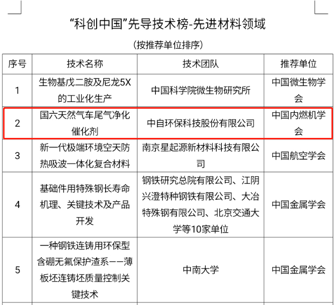 1月10日,由中国科学技术协会发布的2022年“科创中国”系列榜单经初评、终评,遴选出先导技术榜150项、新锐企业榜100项、融通创新组织榜10项、创业就业先锋榜50项、技术经理人先锋榜20项、国际创新合作50项、开源创新榜30项,共计410项拟入榜项目。中自环保科技股份有限公司的“国六天然气车尾气净化催化剂”技术入选“科创中国”先导技术榜-先进材料领域榜单。