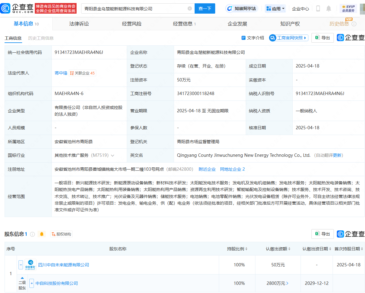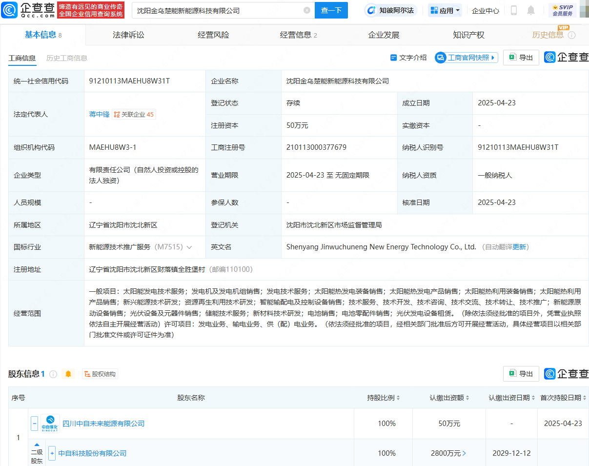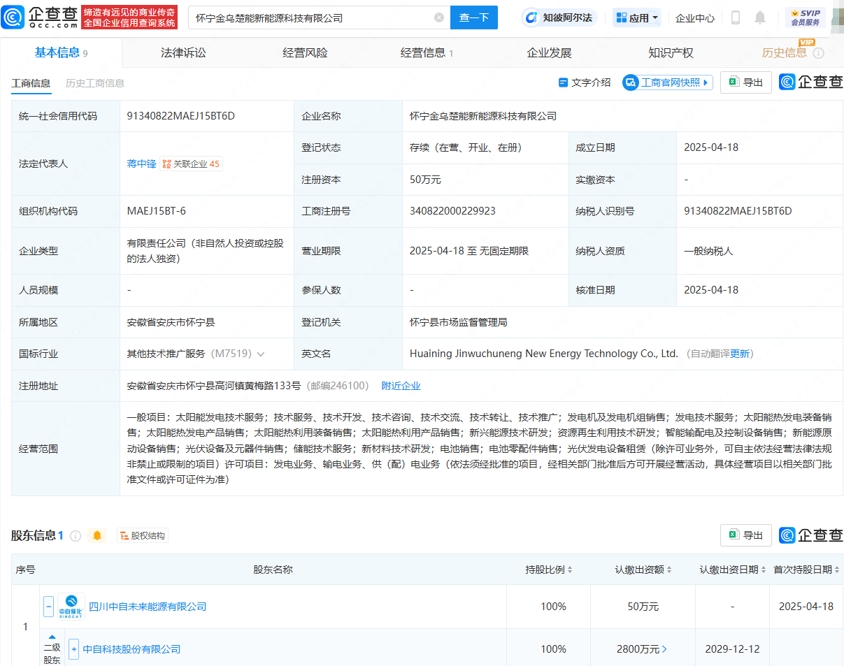近日,怀宁金乌楚能新能源科技有限公司、沈阳金乌楚能新能源科技有限公司、青阳县金乌楚能新能源科技有限公司成立,法定代表人均为蒋中锋,注册资本均为50万元,经营范围均包含:太阳能发电技术服务;发电机及发电机组销售;发电技术服务;新兴能源技术研发;新材料技术研发;电池销售;电池零配件销售等。股权穿透显示,三家公司均由中自科技(688737)间接全资持股。