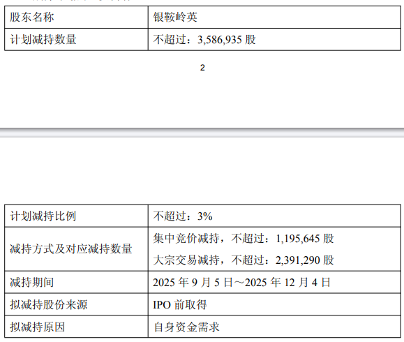 中自科技(688737.SH)昨晚披露关于持股5%以上股东减持股份计划公告称,公司近日收到股东南京银鞍岭英新能源产业投资基金合伙企业(有限合伙)(以下简称“银鞍岭英”)出具的《关于减持股份计划的告知函》,因自身资金需求,银鞍岭英拟通过集中竞价交易方式和大宗交易方式减持其所持有的公司股份数量合计不超过3,586,935股,即合计减持不超过公司总股本的3.00%。其中,通过集中竞价交易方式减持的股份总数不超过1,195,645股,即不超过公司总股本的1.00%;通过大宗交易方式减持公司股份合计不超过2,391,290股,即不超过公司总股本的2.00%;减持期限为自公告披露之日起15个交易日之后的3个月内实施。