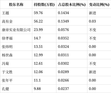 三季报显示,2022年三季度末的公司十大流通股东中,新进股东为王越、于文胜,取代了二季度末的中信证券股份有限公司、张荣进。在具体持股比例上,高有金、张炜明、杨世森、张年平、孔健持股有所上升。