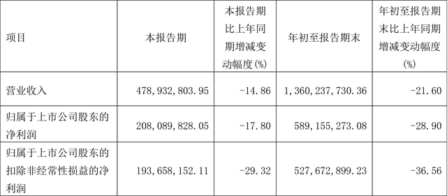 根据三季报,公司第三季度实现营业总收入4.79亿元,同比下降14.86%,环比下降7.00%;归母净利润2.08亿元,同比下降17.80%,环比下降9.58%;扣非净利润1.94亿元,同比下降29.32%,环比下降3.73%。