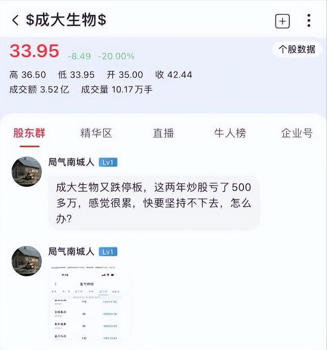 援引尺度股东群内容,今日,某股民在网上公开发帖称,“成大生物又跌停板,这两年炒股亏了500万,感觉很累,快要坚持不下去,怎么办?”