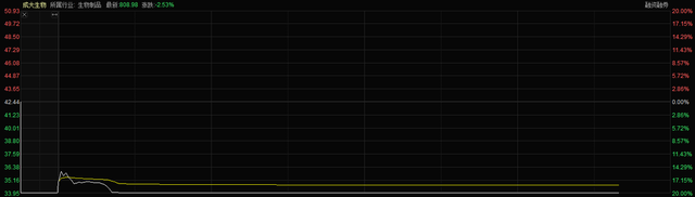 10月28日,成大生物大幅低开,22分钟后触及跌停板。截至收盘,该公司股价为33.95元,总市值为141.4亿元,均创下上市新低。