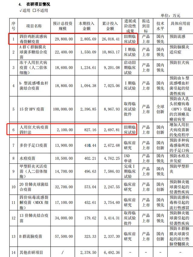 目前,成大生物有14个在研项目,其中仅四价鸡胚流感病毒裂解疫苗、人用狂犬病疫苗四针法两个项目进入Ⅲ期临床试验阶段,其余12个项目距离商业化落地时间更长。