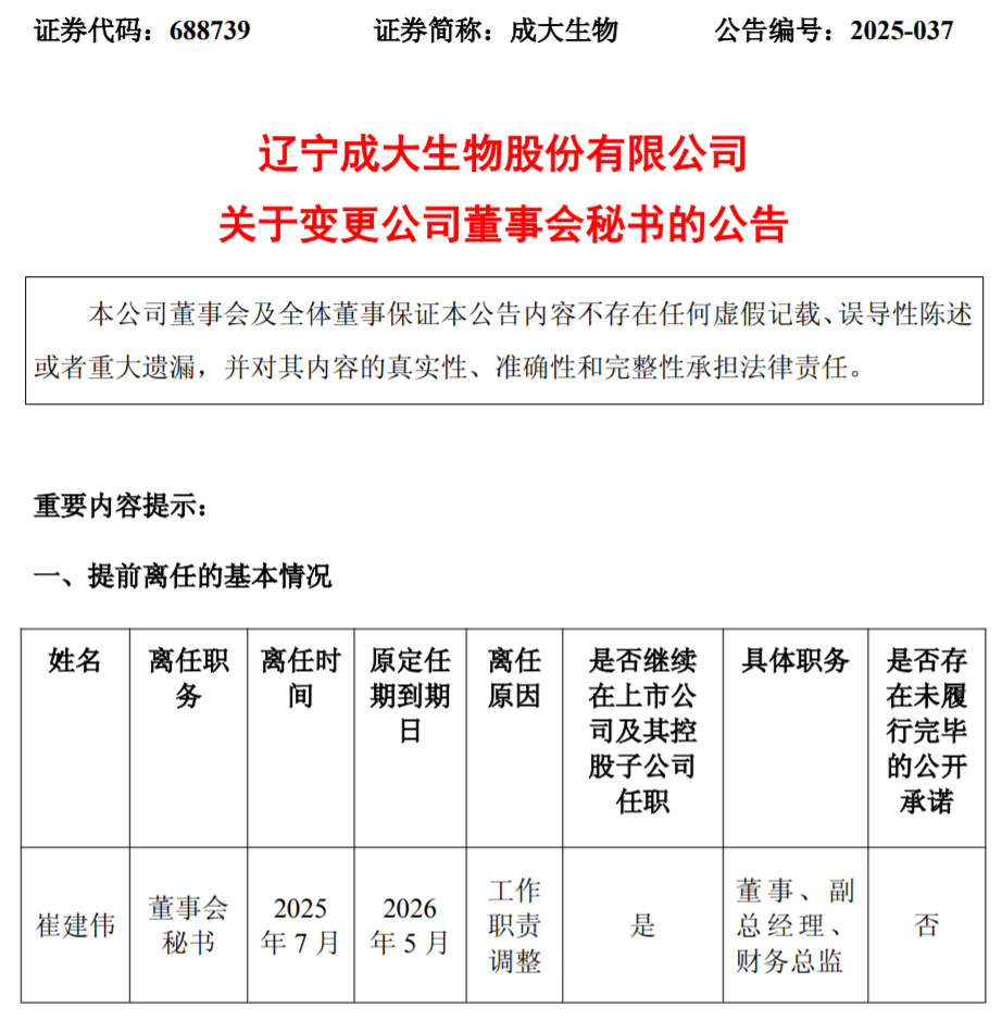 7月29日晚间,成大生物发布关于变更公司董事会秘书的公告:崔建伟先生因工作职责调整原因,不再担任公司董事会秘书职务,仍继续担任公司董事、副总经理及财务总监职务。经公司董事长提名、董事会提名委员会审查,同意聘任李业基先生为公司董事会秘书。