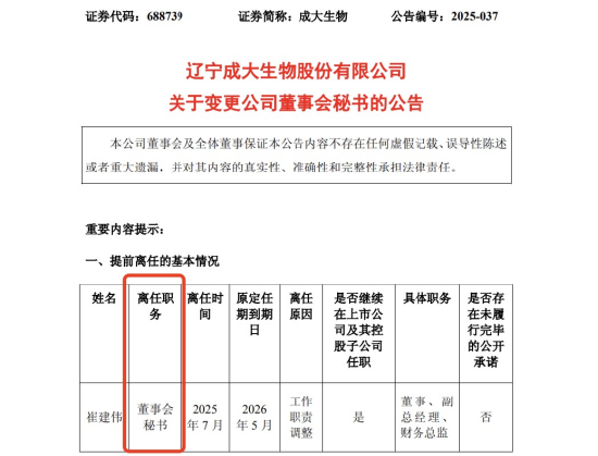更引人注目的是,他今年5月才入职成大生物,仅两个月便执掌董秘要职,这种“空降”速度在上市公司中颇为罕见。