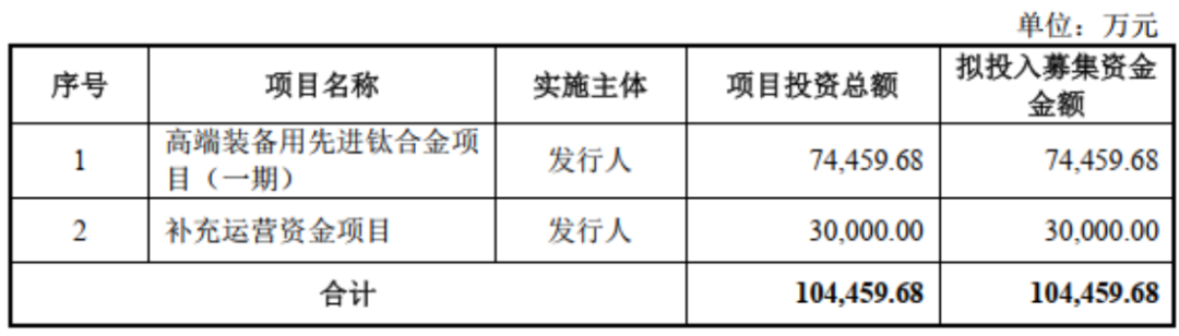 本次上市,金天钛业共募资6.62亿,主要用于“高端装备用先进钛合金项目(一期)”,建成后成年产钛合金棒材2,800吨、钛合金锻坯200吨的产能。
