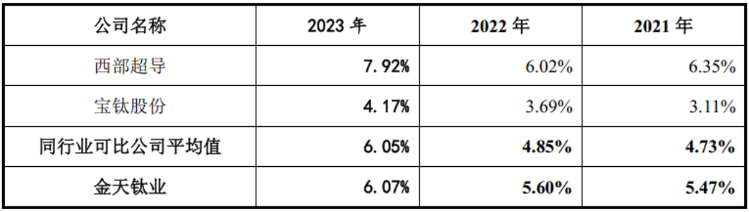 由于宝钛股份业务涵盖各种规格钛及钛合金板、带、棒材,而金天钛业和西部超短更专注高端系列,因此金天钛业毛利率与西部超导最接近,各年在35%左右。