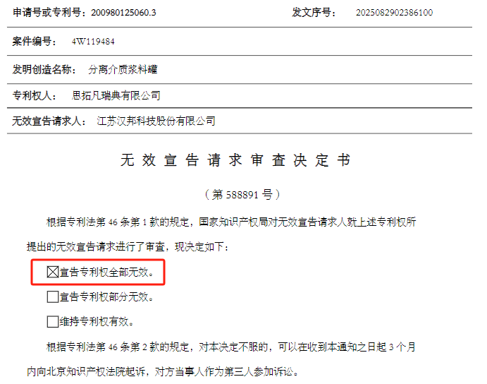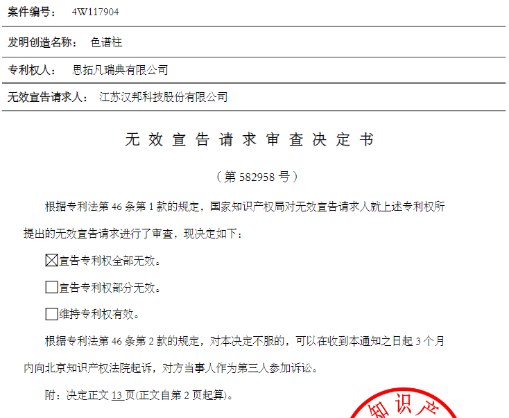 国家知识产权局宣布思拓凡拥有的“分离介质浆料罐”专利权全部无效。这是继此前“色谱柱”专利被宣告无效后,汉邦科技在专利战中赢得的又一关键胜利。