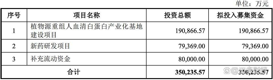 据贝多财经了解,禾元生物于2022年12月递交招股书,报考在科创板上市,禾元生物原计划募资35亿元。其中,19.09亿元将用于植物源重组人血清白蛋白产业化基地建设项目,7.94亿元用于新药研发项目,另外8亿元补充流动资金。