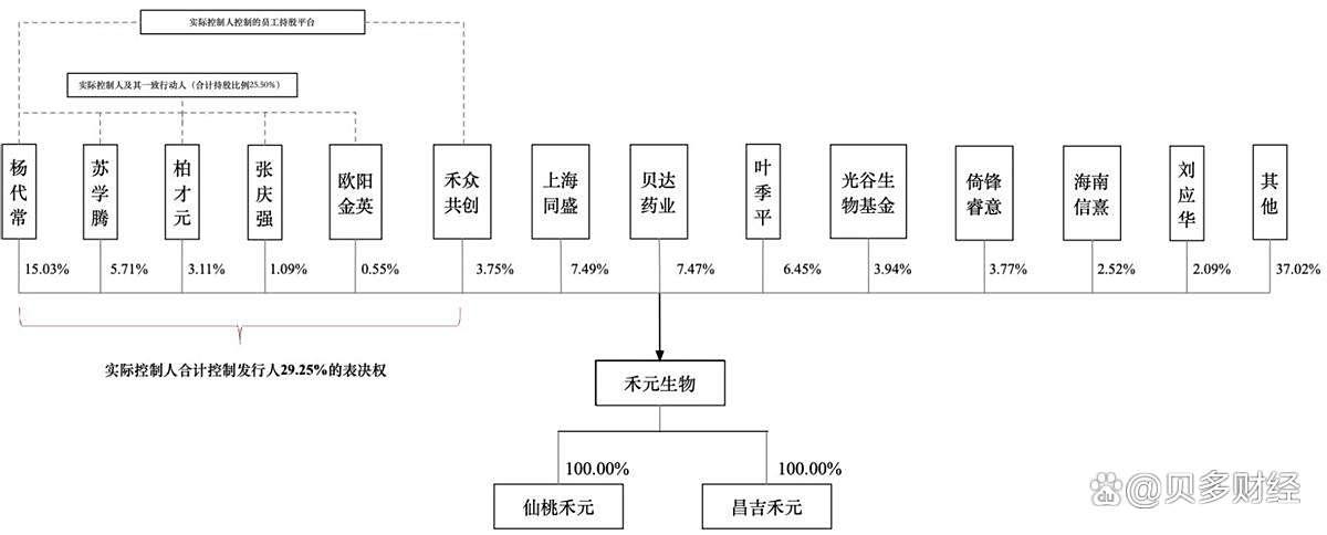本次上市前,禾元生物的实际控制人为杨代常,其控制表决权比例为29.25%,为该公司董事长兼总经理。此外,贝达药业、杭州贝铭合计持有禾元生物9.02%的股份,海同盛及上海双良合计持股7.63%,叶季平持股6.45%,倚锋睿意及倚锋九期合计持股5.31%。