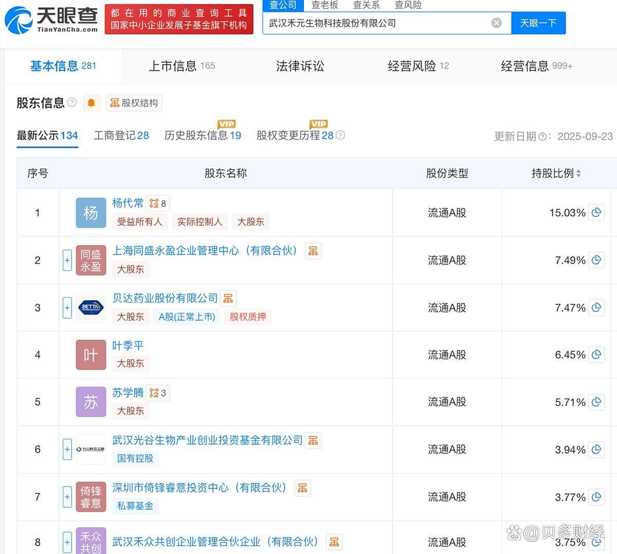 天眼查App信息显示,禾元生物成立于2006年11月。目前,该公司的注册资本为2.68亿元,法定代表人为杨代常,主要股东包括杨代常、贝达药业(SZ:300558)、光谷创投、倚锋资本等。