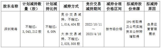 公告显示,因股东深圳南海基于自身运营管理需求,计划根据市场情况通过集中竞价或大宗交易的方式减持其所持有的公司股份合计不超过3,043,212股(不超过公司总股本的6%)。其中,通过集中竞价方式进行减持的,减持期间为本公告披露15个交易日后的6个月内(2022年10月11日至2023年4月10日),减持期间内通过集中竞价方式减持不超过1,014,404股,且在任意连续90个自然日内减持股份总数不超过公司总股本的1%;通过大宗交易方式减持的,减持期间为本公告披露3个交易日后的6个月内(2022年9月16日至2023年3月15日),减持期间内通过大宗交易方式减持不超过2,028,808股,且在任意连续90个自然日内减持股份总数不超过公司总股本的2%。