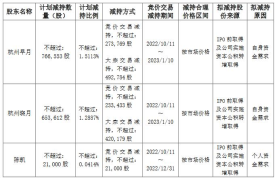因股东杭州早月、杭州晓月自身资金需求,计划根据市场情况通过集中竞价或大宗交易的方式减持其所持有的公司股份不超过1,420,165股,其中,通过集中竞价方式进行减持的,减持期间为本公告披露15个交易日后的3个月内(2022年10月11日至2023年1月10日),减持期间内通过集中竞价方式减持不超过507,202股,且在任意连续90个自然日内减持股份总数不超过公司总股本的1%;通过大宗交易方式减持的,减持期间为本公告披露3个交易日后的3个月内(2022年9月16日至2022年12月15日),减持期间内通过大宗交易方式减持不超过912,963股,且在任意连续90个自然日内减持股份总数不超过公司总股本的2%。