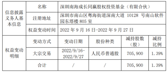 昨晚,普冉股份公告称,公司于昨日收到持股5%以上股东深圳南海成长同赢股权投资基金(有限合伙)(以下简称“深圳南海”)发来的《关于股份减持进展的告知函》,深圳南海在2022年9月16日至2022年9月27日期间内通过大宗交易的方式减持其所持有的公司无限售条件流通股数量705,900股,占公司总股本1.39%。