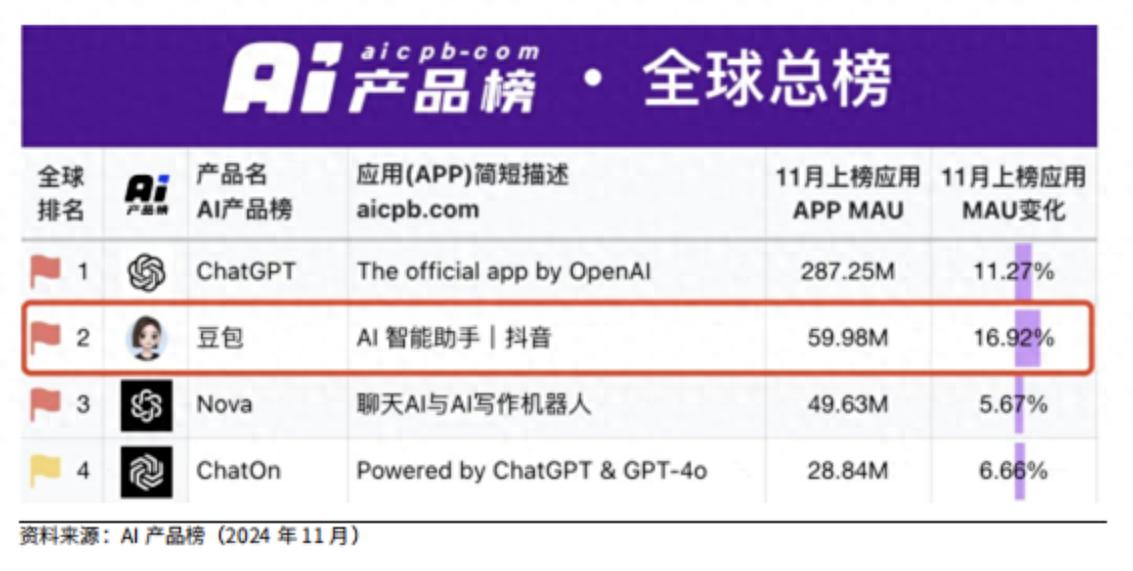在2024年11月的全球月活跃排行榜上,豆包APP的MAU高达5998万,仅次于OpenAI的ChatGPT,位列全球第二。豆包海外版Cici的MAU也达到了1267万,排名第22位。