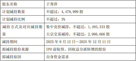 其中,以集中竞价方式减持不超过1,493,333股,不超过公司股份总数的1%;以大宗交易方式减持不超过2,986,666股,不超过公司股份总数的2%。减持期间为自减持计划公告之日起15个交易日后的3个月内。减持期间如遇法律法规规定的窗口期,则停止减持股份。若在上述减持期间内,公司有送红股、转增股本、增发新股等股份变动事项,对应的减持股份数量、价格将进行相应的调整。