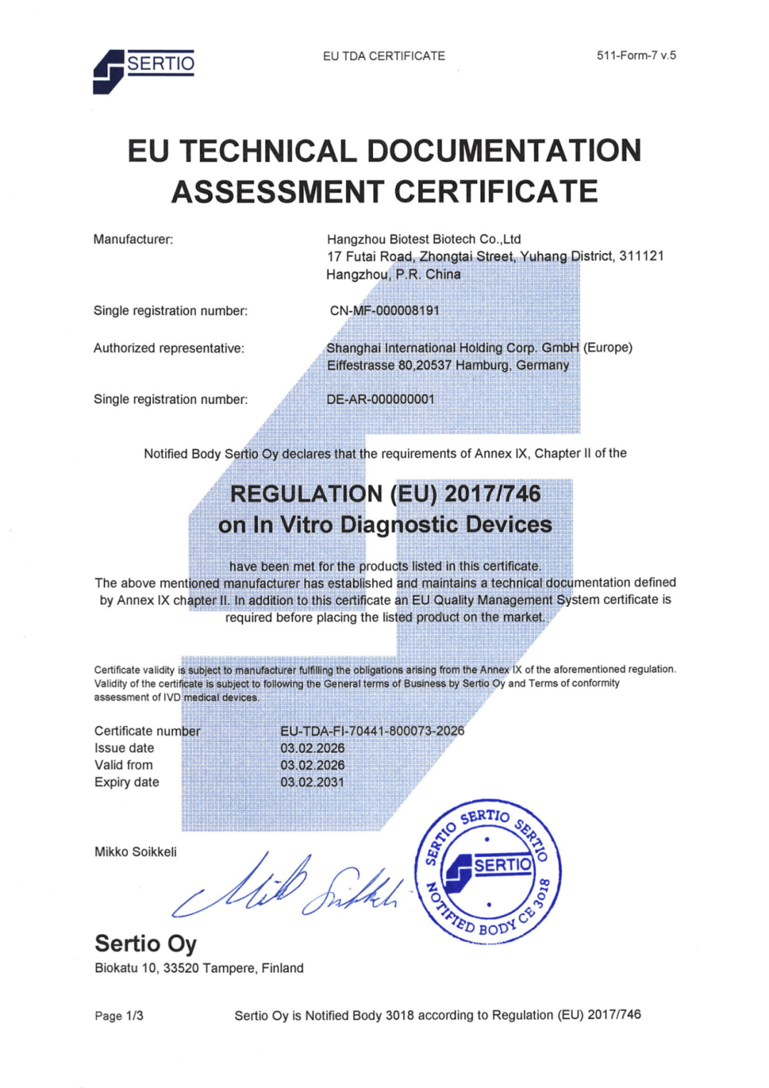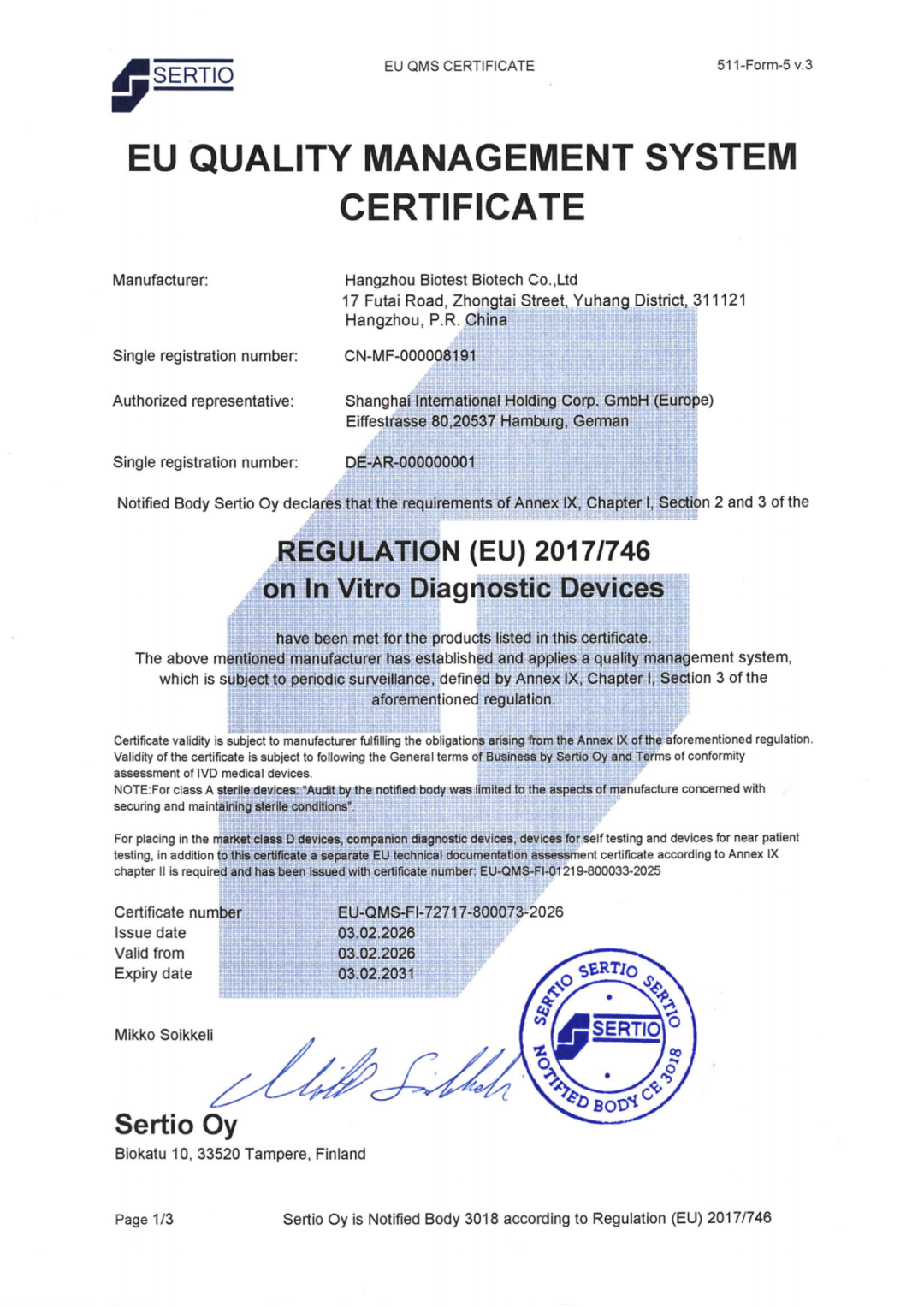 Sertio Oy作为欧盟IVDR官方授权的公告机构,其颁发的认证具备全球公信力。此次产品顺利获证,不仅是对博拓生物研发实力、生产质控水平的高度认可,更彰显了公司产品与国际高标准的全面接轨,为后续拓展全球市场奠定了坚实的合规基础。