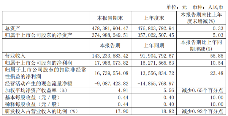 综业快报消息,8月30日,容知日新(688768.SH)发布2021年半年度报告,该公司期内营业收入1.43亿元,同比增长55.85%。归属于上市公司股东的净利润1798.61万元,同比增长10.54%。归属于上市公司股东的扣除非经常性损益的净利润1673.95万元,同比增长23.48%。基本每股收益0.44元。