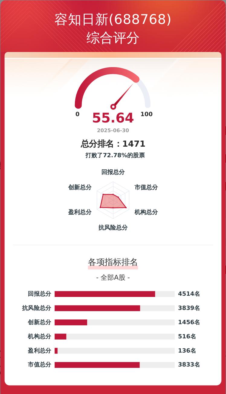 金融界上市公司研究院构建了一套上市公司韧性评价体系,从企业盈利、科技创新、股东回报、经营抗风险、市值表现及机构吸引力六个维度对企业进行量化评分,满分为100分。容知日新的韧性评价总分为55.64分,在A股5405家可比上市公司中排名第1471位。