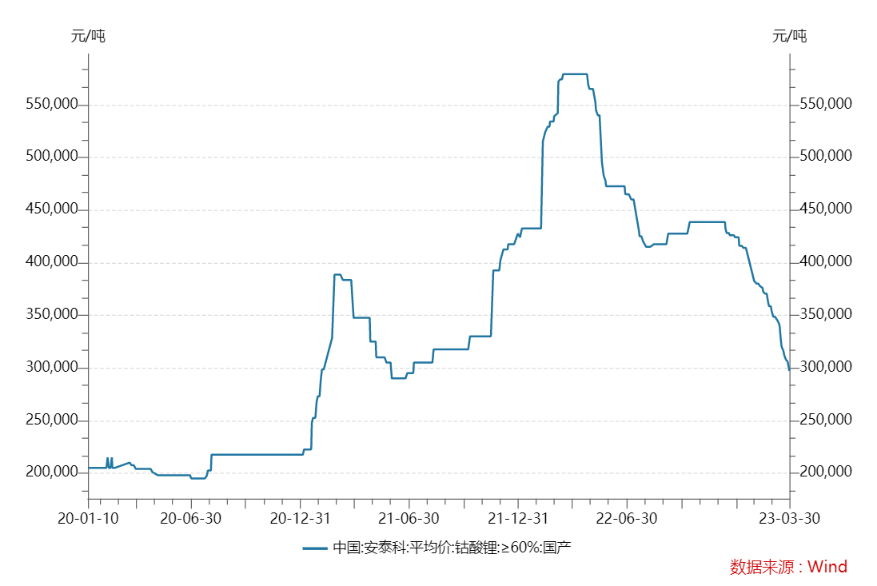 但在这么高的市占率下,珠海冠宇去年净利润依然出现了大幅度下滑。主要原因之一是以钴酸锂为代表的主要原材料价格较上年增长幅度较高,导致生产成本高企。据Wind数据,钴酸锂价格自2022年初持续走高,达到了57.9万元/吨的高位,尽管5月以来价格有所回调,但全年均处于较高位置。