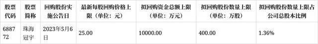 珠海冠宇5月6日发布股份回购公告,公司拟于2023年5月6日至2024年4月26日完成本次公司股份回购计划,本次回购价格不超过25.00元/股,回购总金额不超过人民币10000.00万元人民币,若全额回购且按回购总金额上限和回购股份价格上限测算,预计可回购股份数量不超过400.00万股,拟回购股份数量上限占公司总股本比例为1.36%,具体回购股份的数量以回购期满或终止回购时实际回购的股份数量为准。