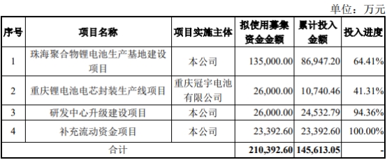 珠海冠宇发行募集资金总额为22.47亿元,扣除发行费用后,募集资金净额为21.04亿元。珠海冠宇最终募集资金净额比原计划少11.45亿元。珠海冠宇于2021年10月11日披露的招股书显示,公司拟募集资金32.49亿元,分别用于珠海聚合物锂电池生产基地建设项目、重庆锂电池电芯封装生产线项目、研发中心升级建设项目、补充流动资金项目。