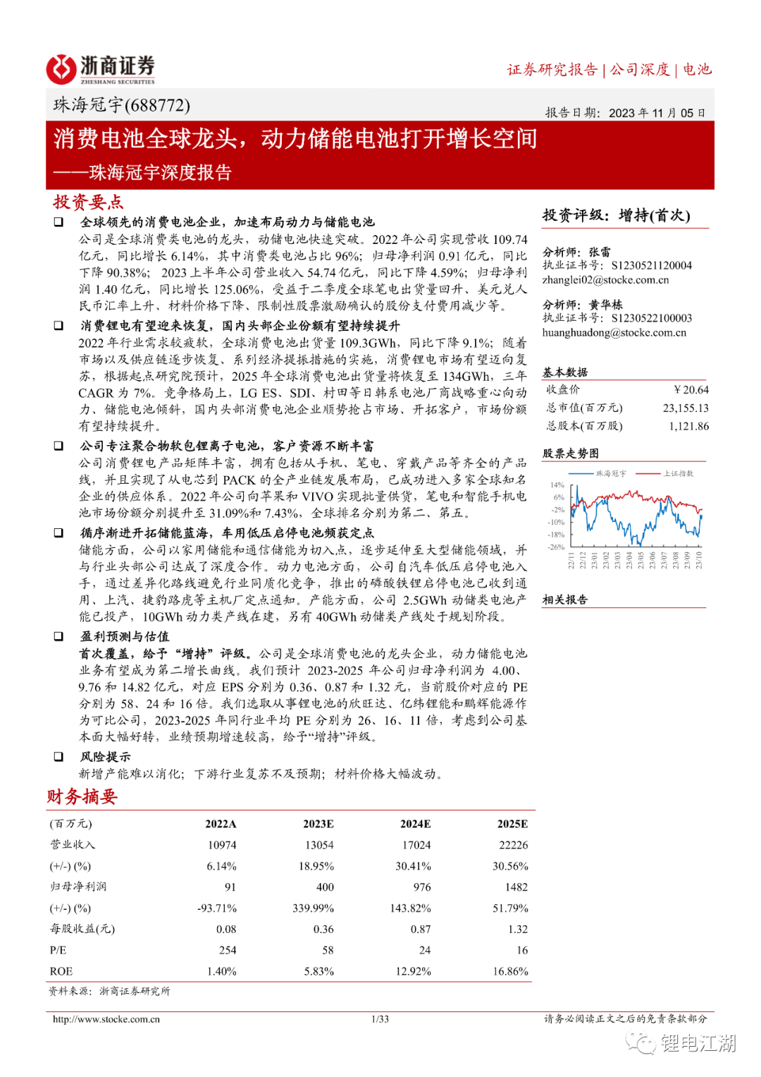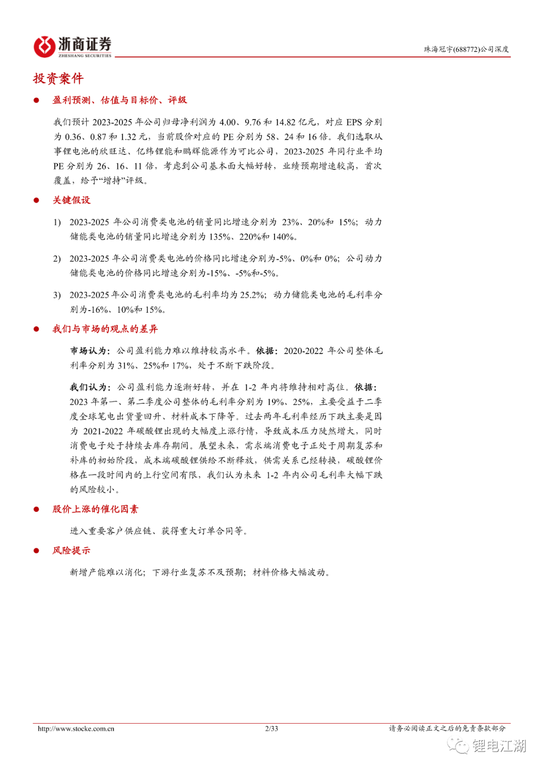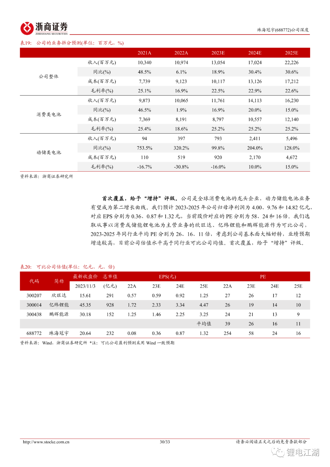 首次覆盖,给予“增持”评级。公司是全球消费电池的龙头企业,动力储能电池业务有望成为第二增长曲线。我们预计2023-2025年公司归母净利润为4.00、9.76和14.82亿元,对应EPS分别为0.36、0.87和1.32元,当前股价对应的PE分别为58、24和16倍。我们选取从事锂电池的欣旺达、亿纬锂能和鹏辉能源作为可比公司,2023-2025年同行业平均PE分别为26、16、11倍,考虑到公司基本面大幅好转,业绩预期增速较高,给予“增持”评级。