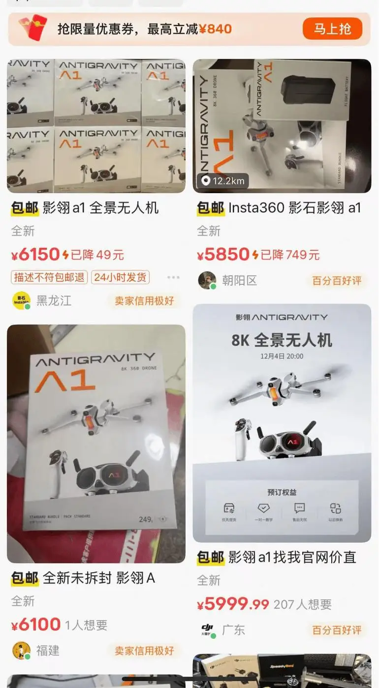 更为隐秘且危险的信号,出现在二手交易平台。在闲鱼上,大量全新未拆封的影翎A1正以8-9折的价格被抛售,这种新品上市即破发的现象,揭开了影石创新渠道管理下的隐秘一角。