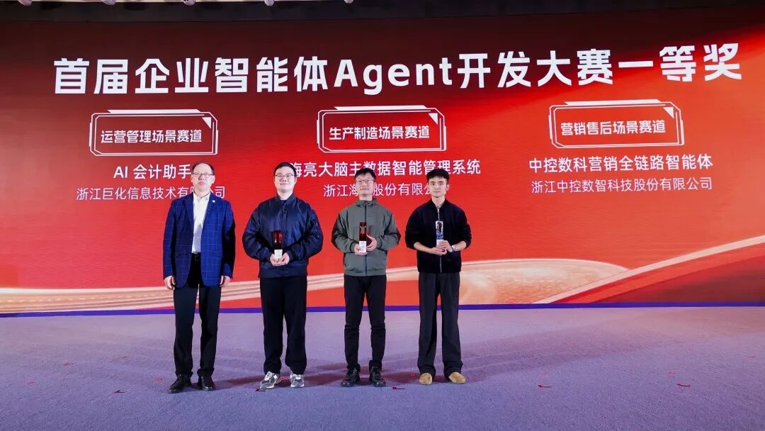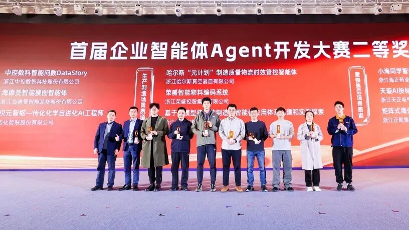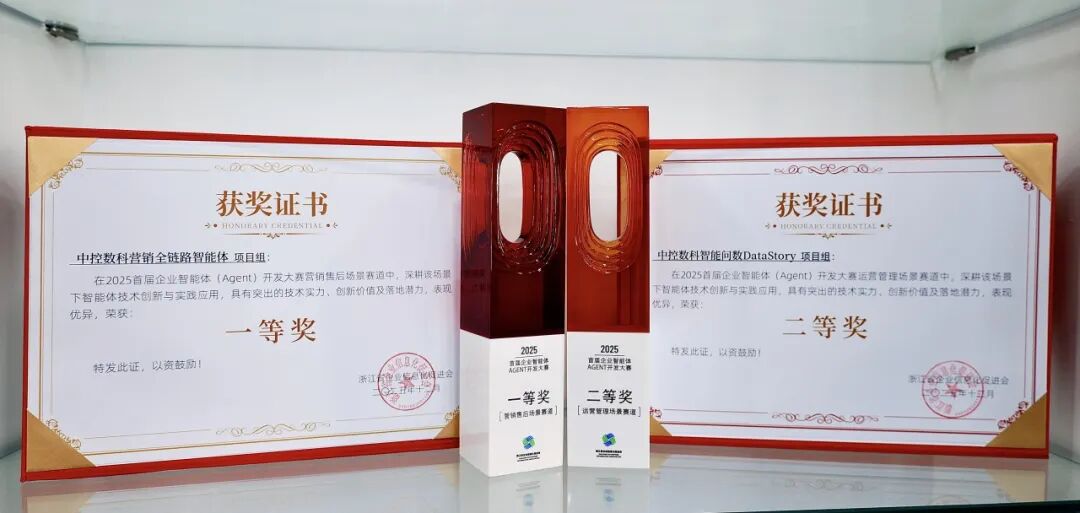 近日,在 浙江省企业信息化促进会 主办的2025首届企业智能体(Agent)开发大赛中, 中控技术 凭借在企业智能体领域的深度实践与卓越成效,从众多优秀项目中脱颖而出,一举夺得两项大奖——“中控智能问数DataStory”项目荣获运营管理场景赛道二等奖、“中控营销全链路智能体”项目荣获营销售后场景赛道一等奖。