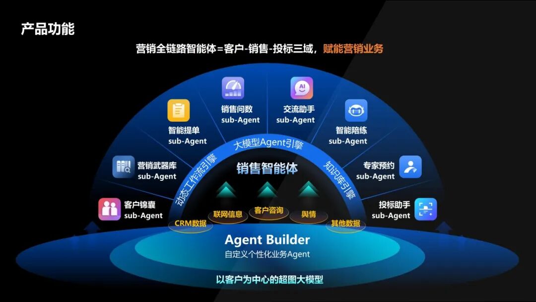 该智能体以“赋能端到端营销”为核心,打造两大核心技术引擎,面向超长文本的处理引擎+以客户为核心的超图推理引擎,贯通从线索挖掘到回款服务的LTC全链路,实现了全景客户洞察、全面销售赋能、投标效率跃升的三大突破。